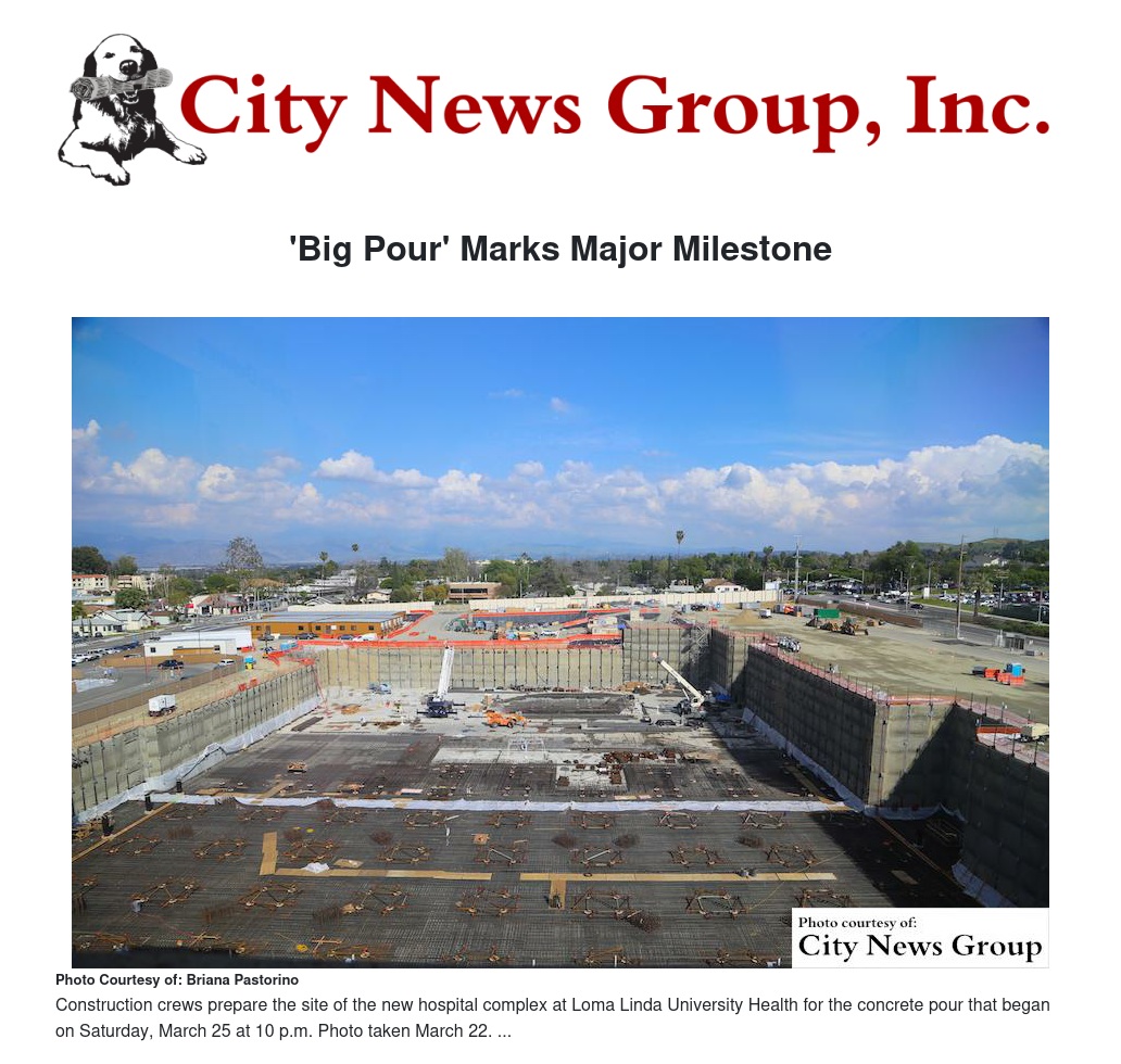 LOMA LINDA>> A major milestone was passed in the construction of the new hospital at Loma Linda University Health. On Thursday, March 23, more than 5,000 yards of concrete was brought in for Saturday March 25th's 10-hour overnight workathon. In what LLU Medical Center CEO Kerry Heinrich calls, "an amazing amount of choreography," at least 550 concrete trucks delivered their loads on the tight schedule of about one per minute. This is the first "Big Pour," as leaders are calling it, of a process that will eventually amount to 18,000 concrete yards and a four-foot-thick foundation reinforced with steel. The pour was conducted on a weekend night in order to minimize impacts on patients, visitors and general traffic in the area. Bright lights were placed to illuminate the milestone in the construction of Loma Linda's new hospital complex.