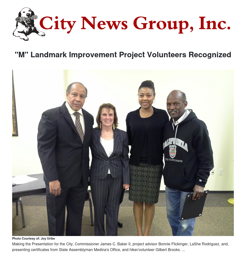 At the regular Parks and Recreation Commission Meeting held on March 13th, the remainder of the "M" Landmark Improvement Project volunteers were recognized for their efforts of last years renovation "M" project. The main recognition ceremony was held on January 24th at City Hall but many were not able to attend.