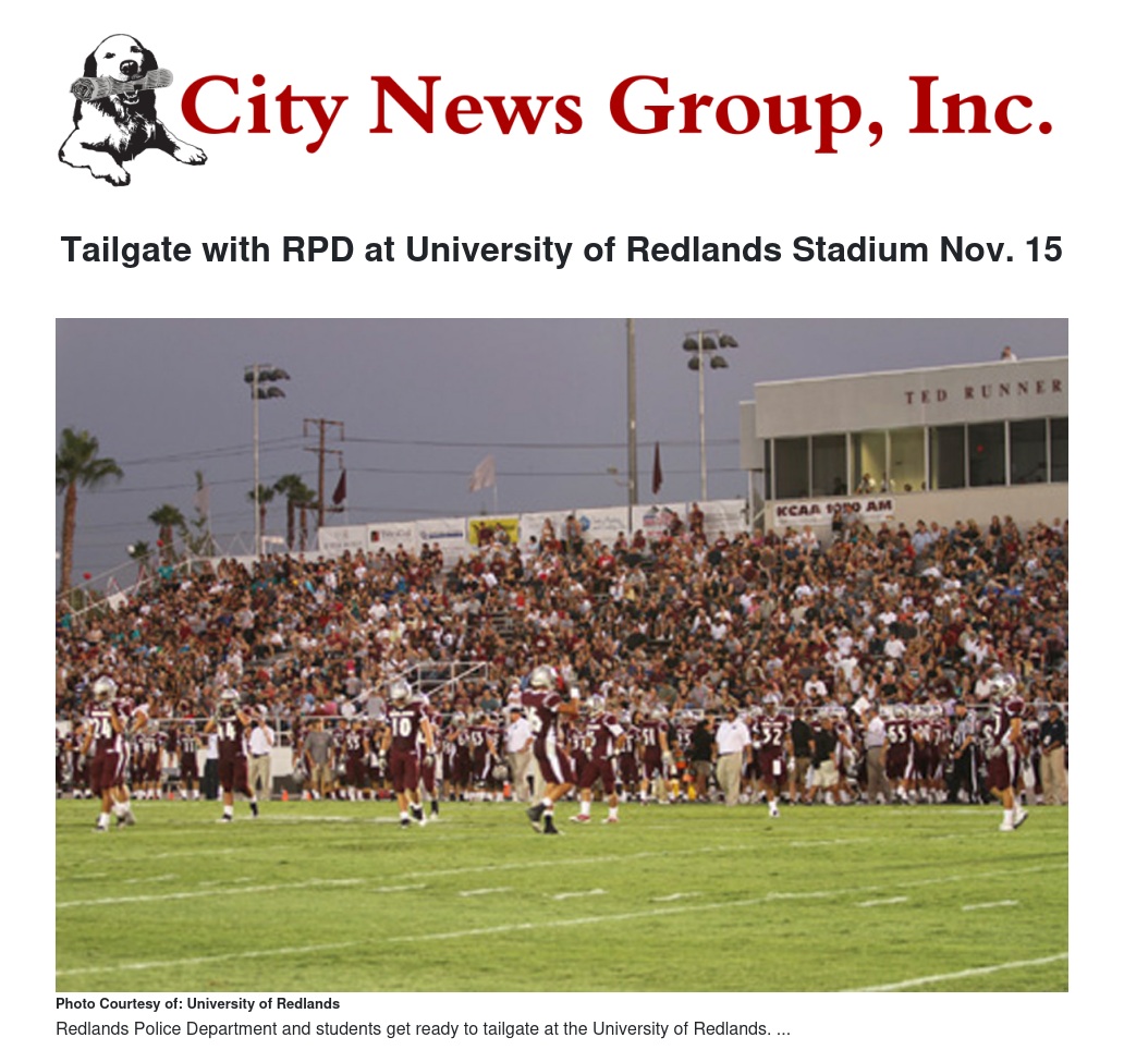 The Redlands Police Department invites students from fourth through 12th grades to tailgate with RPD officers at the University of Redlands on Saturday, Nov. 15, and then enjoy the football game as the Bulldogs play Occidental College.