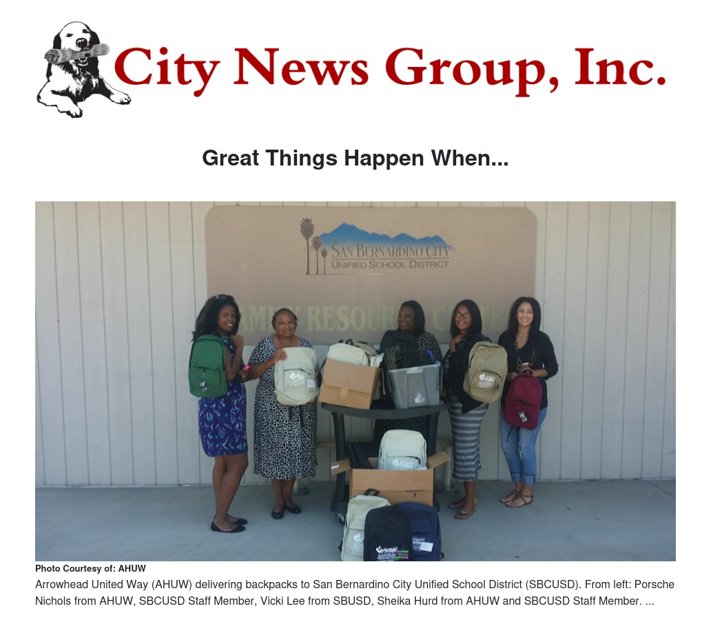 Arrowhead United Way is supporting these families in need through its annual School Supply Drive, providing basic school supplies, including backpacks, to students in the Colton Joint, Rialto, and San Bernardino Unified School Districts.