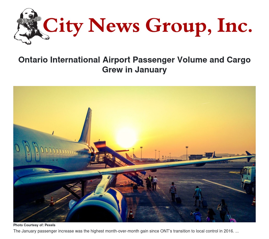Ontario International Airport (ONT) continued the momentum gained over the past year by posting a more than 10% increase in passenger volume in January. At the same time, cargo shipments continued their double-digit increases, growing more than 22%.