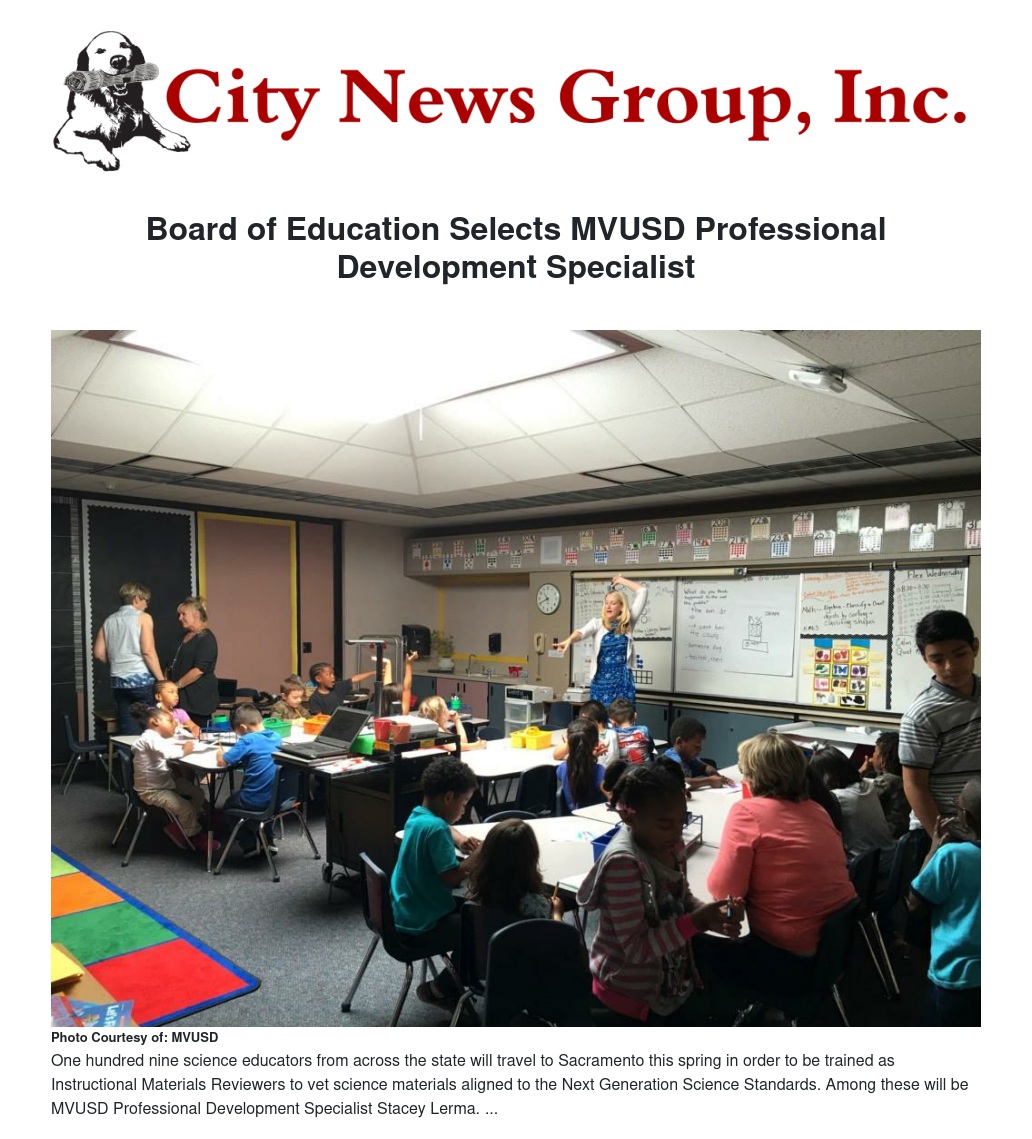 One hundred nine science educators from across the state will travel to Sacramento this spring in order to be trained as Instructional Materials Reviewers to vet science materials aligned to the Next Generation Science Standards. Among these will be MVUSD Professional Development Specialist Stacey Lerma.