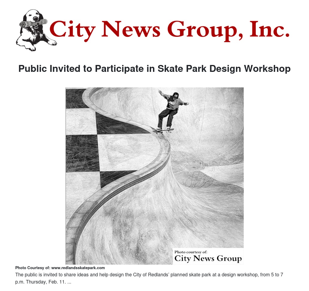 The City of Redlands will host the public design workshop with the California Skateparks design team at the Redlands City Council Chambers, 35 Cajon St.