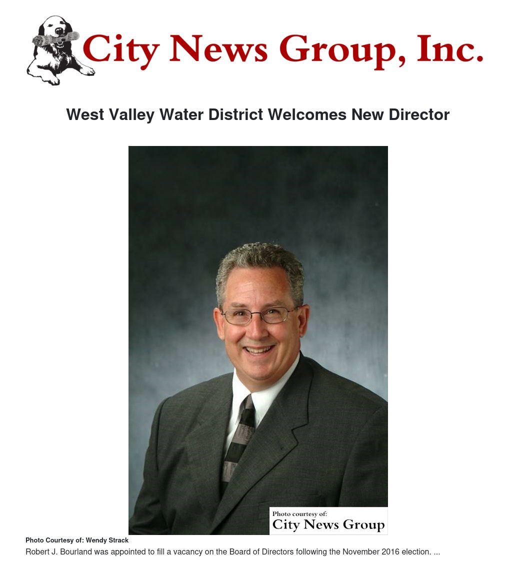 SAN BERNARDINO> The West Valley Water District Board of Directors recently announced that Robert J. Bourland was recently sworn in at their regularly scheduled meeting to fill a vacancy on the Board of Directors following the November 2016 election.