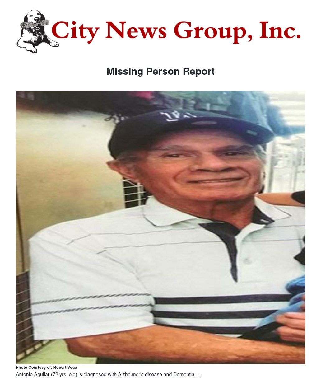 On 11-21-17, the Colton Police Department responded to a report of a missing person. Upon arrival officers identified the missing person as Arturo Aguilar 5’5”/140 lbs, Wht hair/Brn eyes, last seen wearing a black “LA” Dodgers hat, Blk/Wht checkered sweater and blue pants. Family members reported Aguilar is diagnosed with Alzheimer’s disease and Dementia. Family stated Aguilar left the residence on foot possibly heading to his home located in the 700 block of S. 5th Street, Colton, CA. A coordinated search for Aguilar was conducted by Colton Police officers, the San Bernardino County Sheriff’s Department Aviation Division, and the San Bernardino County Sheriff’s Department Bloodhound Unit. Aguilar was not located and the investigation is ongoing. The Colton Police Department is encouraging anyone in the community who sees or knows Aguilar’s whereabouts, call the Colton Police Department or their local Law Enforcement agency. Anyone with any additional information is asked to contact Detective Tony Jaeger at (909) 370-5000.
