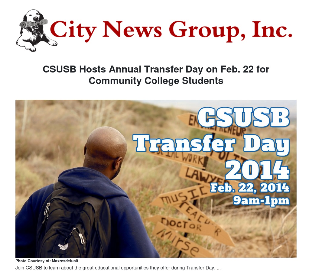 Community college students interested in attending Cal State San Bernardino are invited to attend the university’s annual Transfer Day on Saturday, February 22. Aimed at providing information and assistance to community college students interested in transferring to CSUSB, the free event will allow community college and university transfer students to learn more about financial aid, housing, EOP, student services and clubs and organizations. “It’s crucial for students interested in transferring to Cal State San Bernardino to know about the latest admission requirements and deadlines,” said Lucia Zarate, an admissions counselor at Cal State San Bernardino. “Transfer Day was created to give students the opportunity to visit CSUSB to make sure it is the right fit for them. We will showcase what we have to offer to further their education and gain valuable life experiences.” Faculty members representing most academic programs will be available to meet with attendees to discuss their potential majors or fields of study. Campus tours will also be offered. Transfer Day will run from 9 a.m. to 1 p.m. in the university’s Santos Manuel Student Union. Complimentary parking will be available in Lot D. Those planning to attend should RSVP by February 17 to asrevents@csusb.edu or call (909) 537-5192.