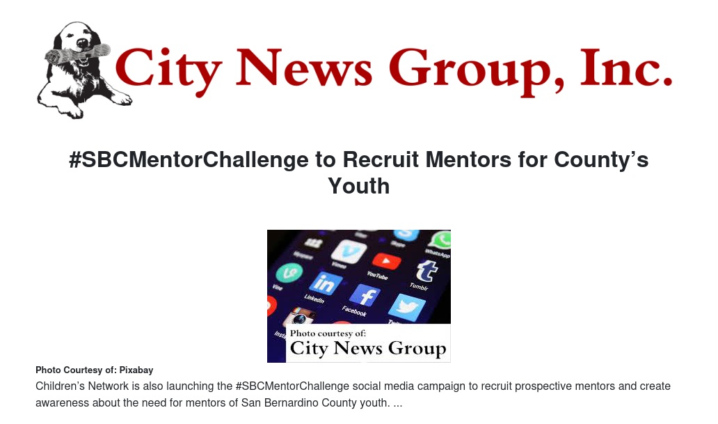 Children’s Network is also launching the #SBCMentorChallenge social media campaign to recruit prospective mentors and create awareness about the need for mentors of San Bernardino County youth. Community members are encouraged to participate in the #SBCMentorChallenge campaign which will highlight the importance of mentors.