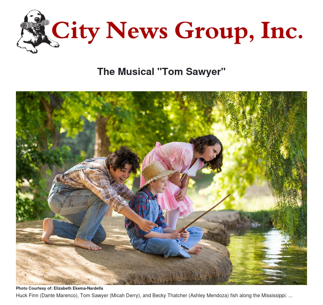 “Tom Sawyer” features Micah Derry in the title role. The colorful cast of characters also includes Dante Marenco as Tom’s cohort Huck Finn, Daryon Robinson as Jim, Paul Zanone as the villainous Injun Joe, Michael Daehne as the befuddled Muff Potter, Ashley Mendoza as Tom’s crush Becky Thatcher, and Sarah Pearce as Aunt Polly. Also featured are Lilly Spencer as Mary, Christian Groza as Sidney, Scott Dieninger as Judge Thatcher, Liam Blanck as Ben Rodgers, Zachary Michel as Jeff Thatcher, Karisa Harriman as Widow Douglas, Leilani Baldwin as Amy Lawrence, and Tom Williams as Mark Twain.