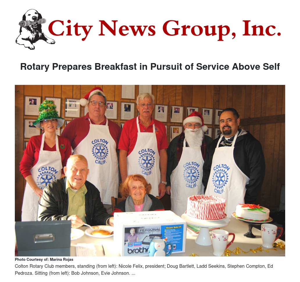 “Our motto is ‘Service Above Self,” said Felix in explanation of what the Colton Rotary Club is all about. “We serve our community and welcome anyone who would like to come and join us. We would like to extend an open invitation to come check us out by visiting our meetings each Friday at 12:15 p.m. at the Denny’s at 160 W. Valley Boulevard in Colton."