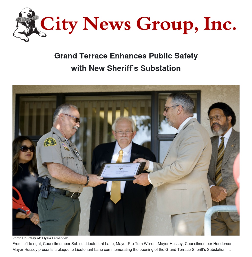 June 11, 2023 - In a momentous occasion marked by a ribbon-cutting ceremony, the City of Grand Terrace celebrated the official opening of its new Sheriff’s Substation. The event, attended by Mayor Bill Hussey, members of the City Council, and officials from the San Bernardino County Sheriff’s Department, highlighted a significant step forward in bolstering public safety in the community.