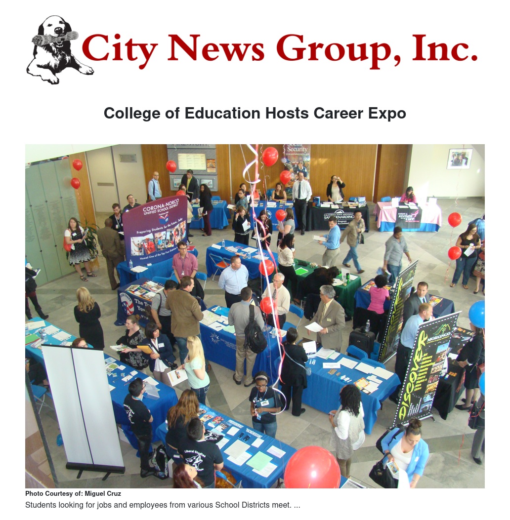 Students brought their resumes and broke out their ties for the California State University San Bernardino (CSUSB) College of Education's recent annual Career Expo. Although the event was open to all majors, it was geared toward those who are pursuing teaching credentials and education majors. School Districts from Corona, Riverside, San Bernardino, even as far away as Oakland Unified School District (OUSD) came in search of potential employees. Information was also provided for those interested in entering a Masters program for Advanced Credentials.