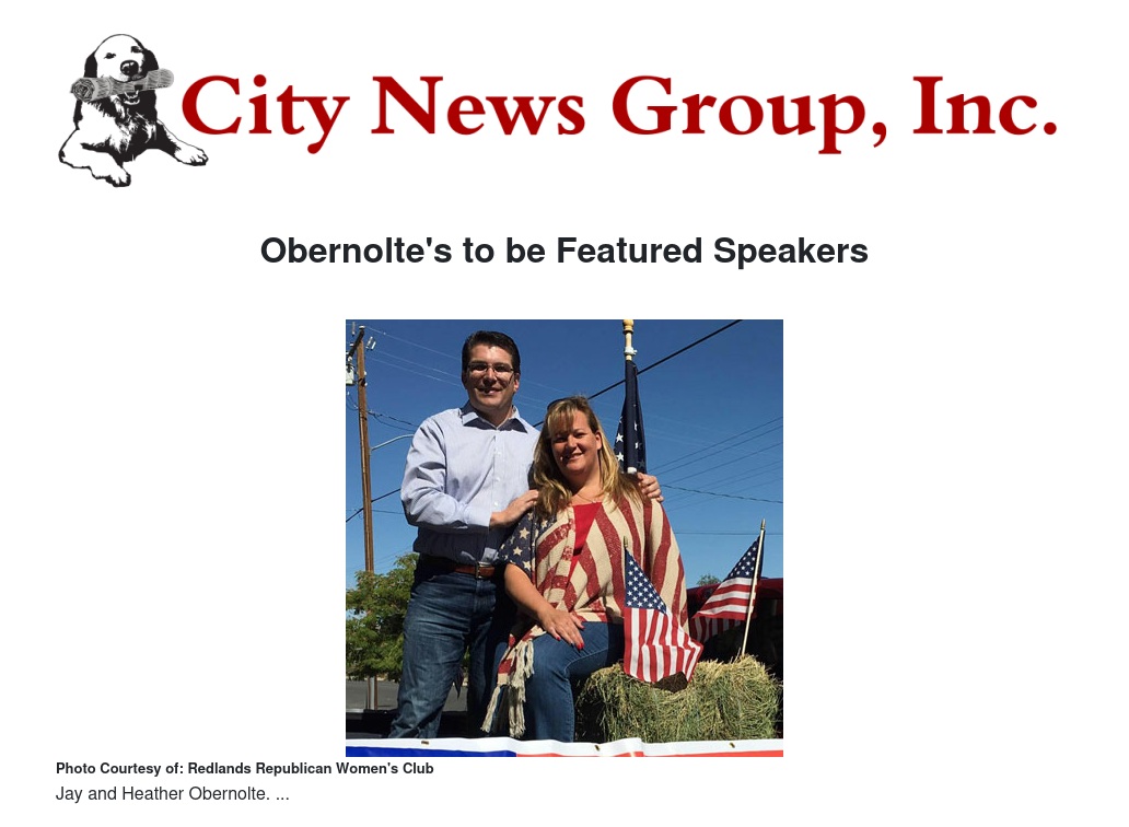 On Friday, May 17, 2019, the Redlands Republican Women’s Club is pleased to announce that California Assemblyman Jay Obernolte and his wife, Heather, will be the featured speakers at the Club's lunch meeting. The meeting will be held at the Redlands Country Club starting at 11:30 AM, with lunch served at noon, and the presentation scheduled at 12:30 PM. The cost for lunch is $20 and reservations must be made by May 15. For reservations call Laurie Tremain at (909) 792-2501. if you want to hear the speakers and not have lunch, there is no cost and there will be seats available. College students are invited to attend and lunch will be free.