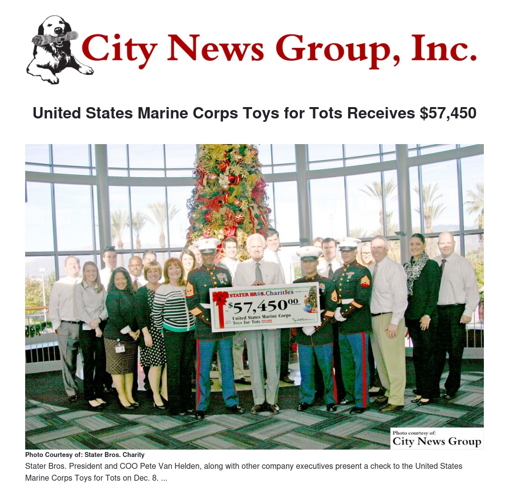 “The Stater Bros. ‘Family’ believes in giving back to the communities we serve,” said Jack H. Brown, Chairman of the Board and Chief Executive Officer of Stater Bros. Markets. “We are very proud to once again provide funding to the Marine Corps Toys for Tots Program so that many more children will have their holiday wishes come true.”