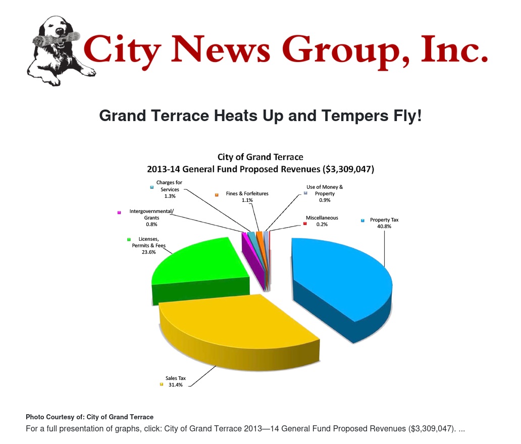 “The proposed budget for fiscal year 2013–14 projected a general fund deficit of $674,713. Why is Measure C asking for $1.1 million? Have the current Council and Staff been good stewards of our tax dollars?” asked Mark Jolstead. “With the hundreds of thousands of dollars being spent on studies, reports, and marketing materials to cram this Measure C down our throats, have they considered the impact on the loss of local businesses and possible effects on our sales tax dollars? Many local businesses feel the Grand Terrace Area Chamber of Commerce is not representing them regarding this issue.” In a letter from the Chamber of Commerce President Stacey West to its members, the Chamber is directing business owners who feel they may be impacted by Measure C to contact Betsy Adams, the Grand Terrace City Manager. There could be caps on maximum utility taxes as approved by the City Council.