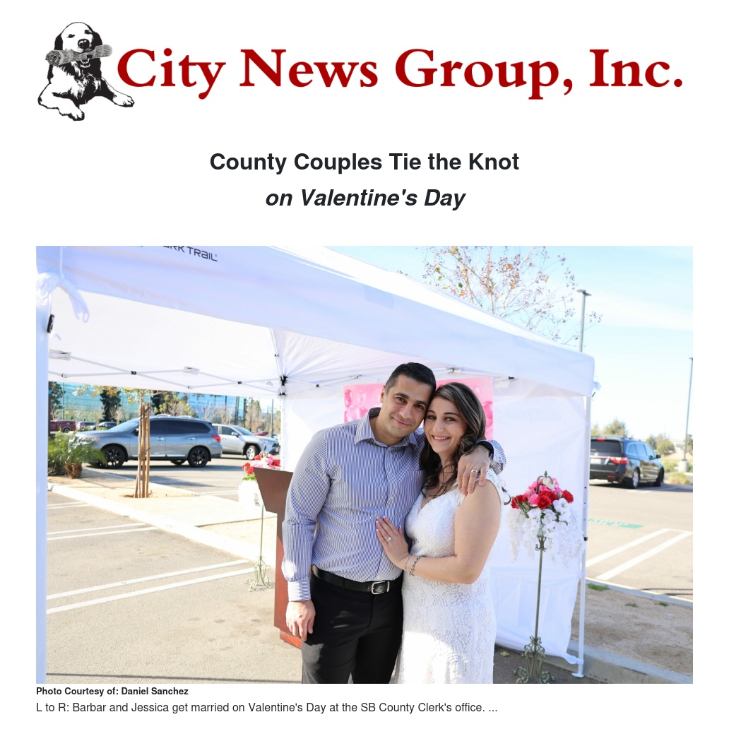 “Valentine’s Day is a very busy day for county clerks throughout the state of California,” said Bob Dutton, San Bernardino County’s Assessor-Recorder-Clerk. “This year, the San Bernardino County Clerk expanded marriage services to take place outdoors, taking advantage of Southern California’s beautiful sunny weather and adhering to local public health guidelines to keep both staff and the public safe.”
