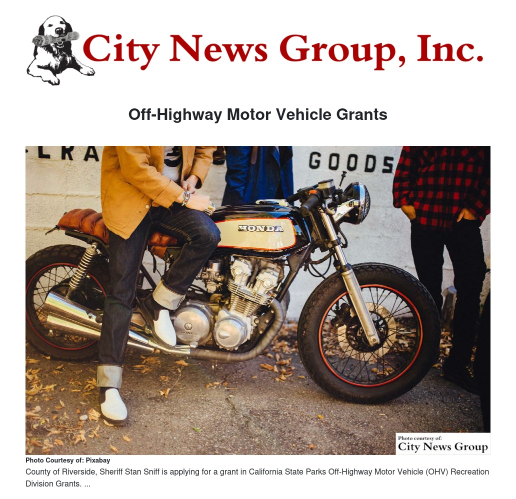 MORENO VALLEY >> On behalf of the County of Riverside, Sheriff Stan Sniff is applying for a total of $156,920 in California State Parks Off-Highway Motor Vehicle (OHV) Recreation Division Grants & Cooperative Agreements Program funding for Law Enforcement Projects.