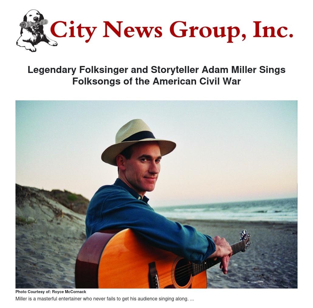 • A reviewer in Melbourne Beach, Florida, said that Adam Miller’s presentation is “even more accessible than most good folk music. His stories are not the boring ‘once-upon-a-time’ kind, but rather keep you in a constant state of suspense, and his gentle, building guitar chords heighten it. It's all about how folk music lives on through oral tradition and has a kind of ‘betcha didn't know you've done it too!’ kind of theme. It will charm even the most die-hard of ipod loving kids or reluctant significant-others.”