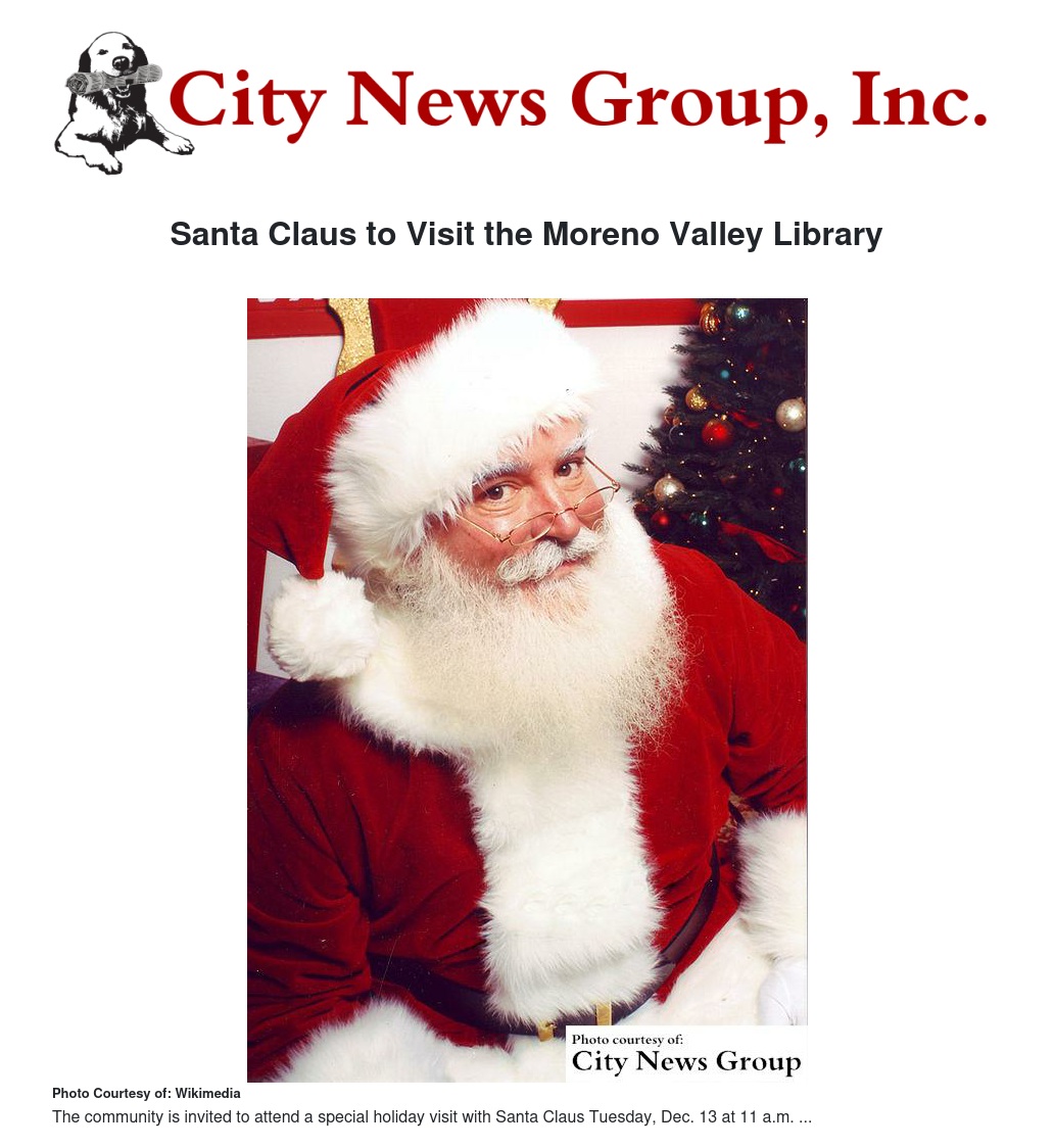 MORENO VALLEY>> Residents are invited to join in on the Christmas fun at the Moreno Valley Public Library on Tuesday, Dec. 13 at 11 a.m. for a special holiday visit with Santa Claus.