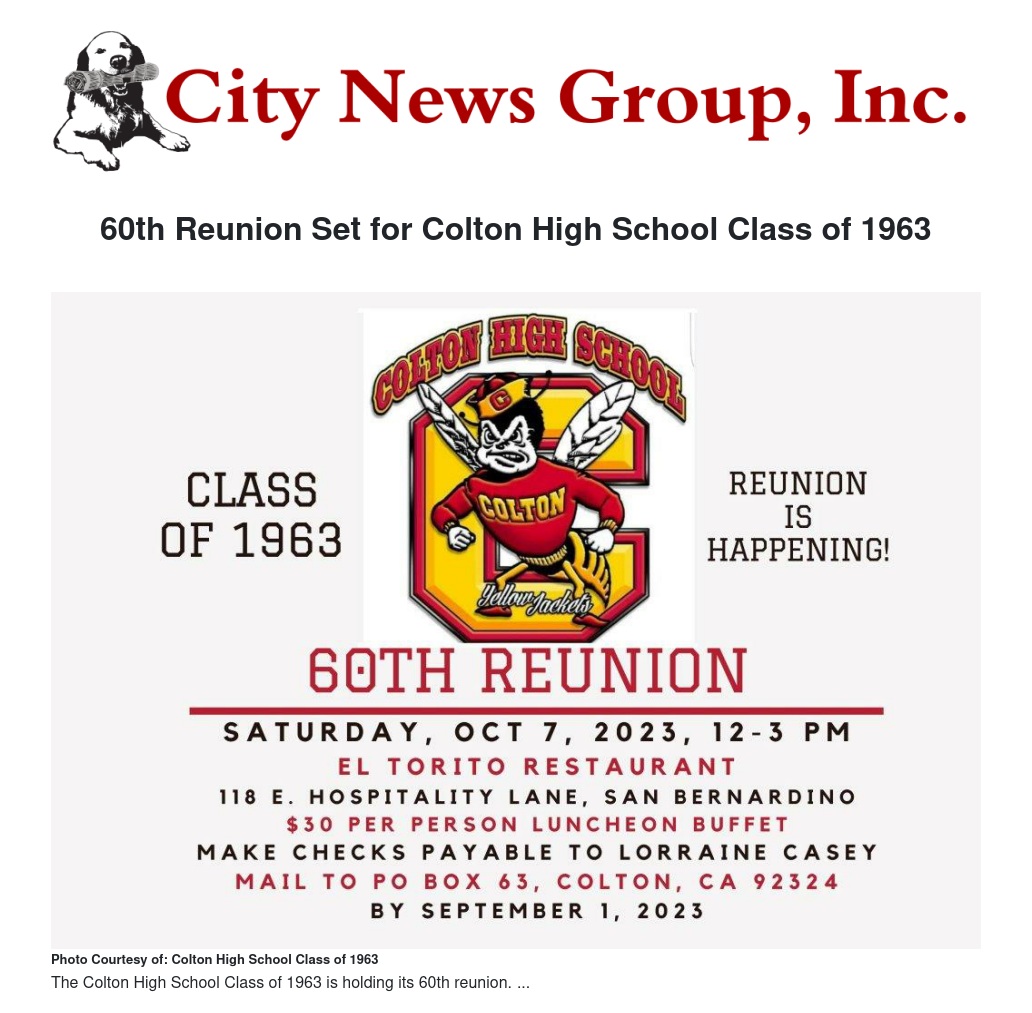 Colton High School Class of 1963 Facebook announcement includes 60th invitation and photos of past reunions. Be sure to click on “join” to get the latest updates.