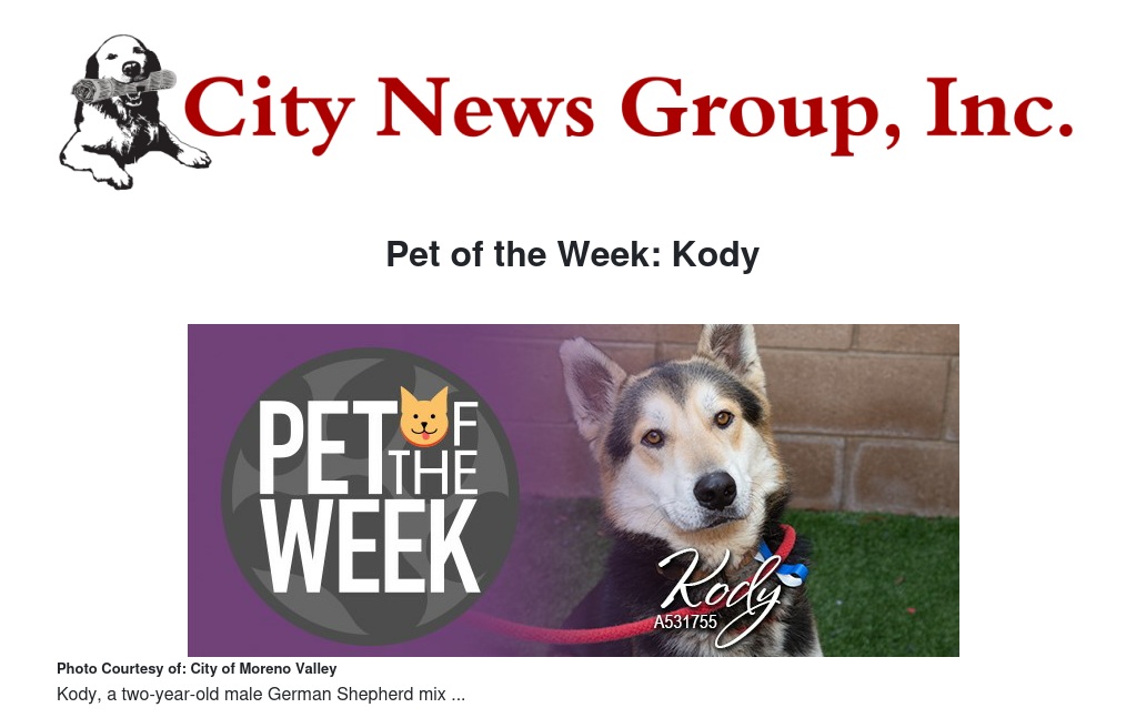 If you would like to make Kody or any pet from the Moreno Valley Animal Shelter part of your family, please contact the Moreno Valley Animal Shelter at 951.413.3790 or visit www.moval.org/pets.