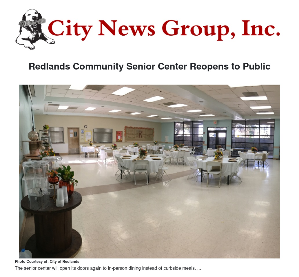 The Redlands Community Senior Center, 111 W. Lugonia Ave., reopened for public classes and programs began on Monday, Aug. 2. Center hours of operation are 10 a.m. to 2 p.m. Monday through Friday. A complete schedule of classes and programs can be found on the City’s website at www.cityofredlands.org/seniors.