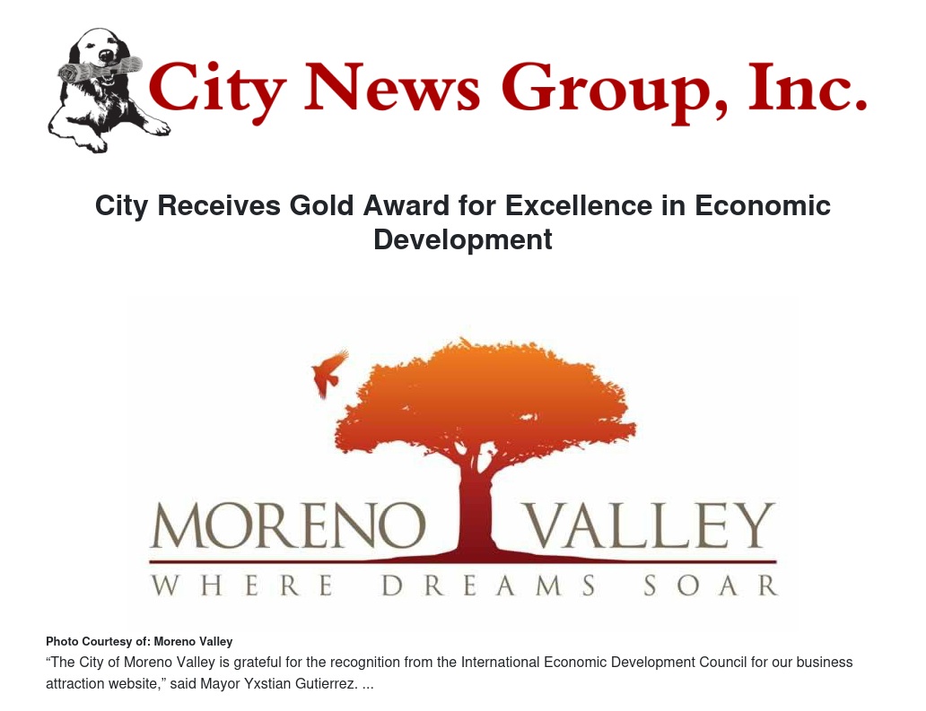 The City of Moreno Valley was honored to receive a Gold Excellence in Economic Development Award from the International Economic Development Council for its Moreno Valley business attraction website (morenovalleybusiness.com).