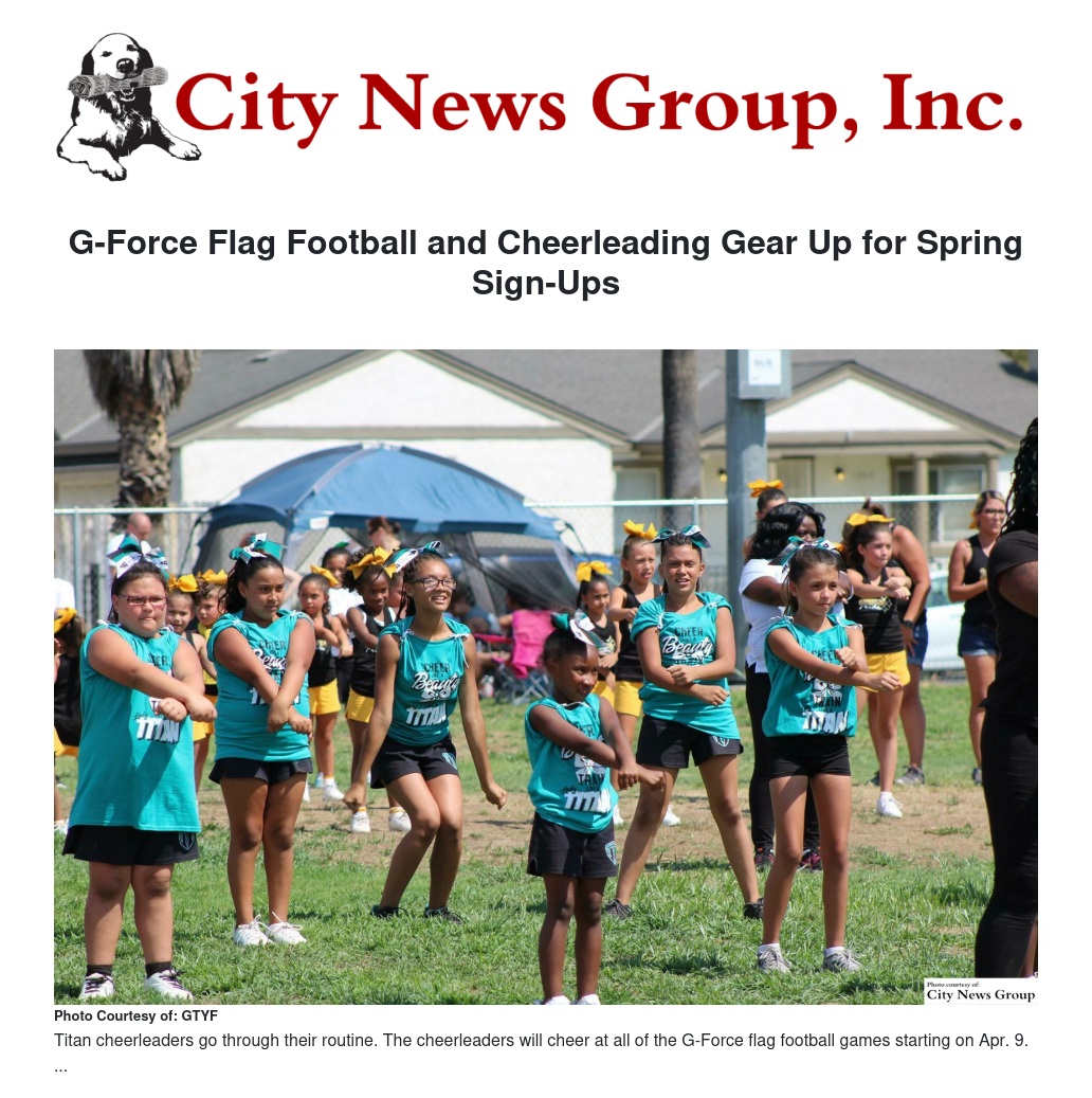 GRAND TERRACE>> G-Force Titans NFL Flag Football and Titans Spring Cheer online sign-ups are taking place for children between the ages of 5-14 years old.