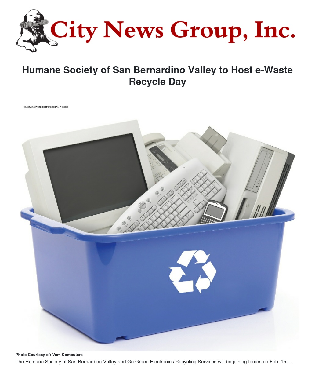 From 8 a.m. to noon, the Humane Society of San Bernardino and Go Green Electronics Recycling Services will be hosting a one-day electronic recycling fundraiser.