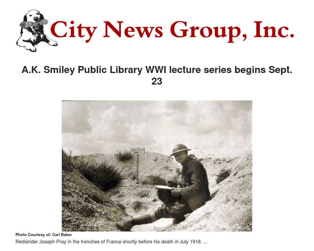 As part of the commemoration of the centennial of World War I, the A.K. Smiley Public Library will host a lecture at 11 a.m. Saturday, Sept. 23, in the library’s Assembly Room. Presented by historian Dr. Ann Deegan, “Entering into Service” will explore the ways that Redlands men joined the military effort during the Great War.