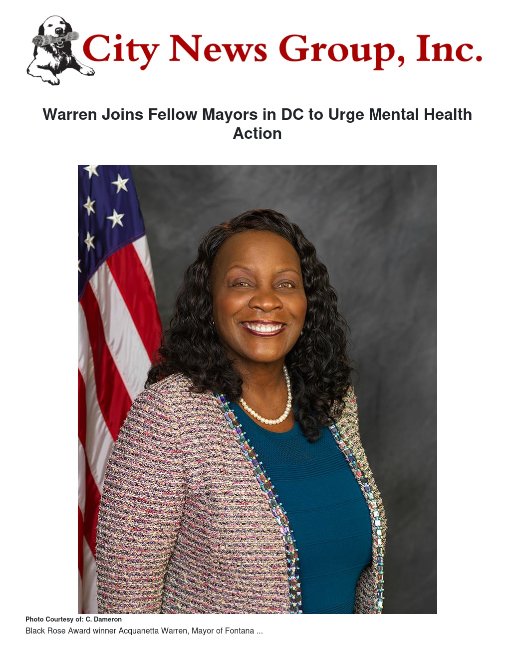Fontana Mayor Acquanetta Warren this week joined a bipartisan delegation from the U.S. Conference of Mayors (USCM) in urging members of Congress to adopt comprehensive legislation to address the mental health crisis.