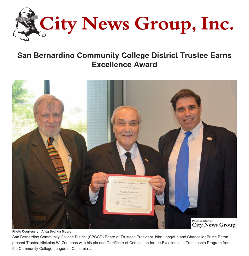 SAN BERNARDINO >> Nickolas W. Zoumbos, representative of Area 5 for the San Bernardino Community College District (SBCCD) Board of Trustees, has completed the Excellence in Trusteeship Program offered by the Community College League of California (CCLC). He was presented with the certification of completion at the Board’s regular meeting on April 14.