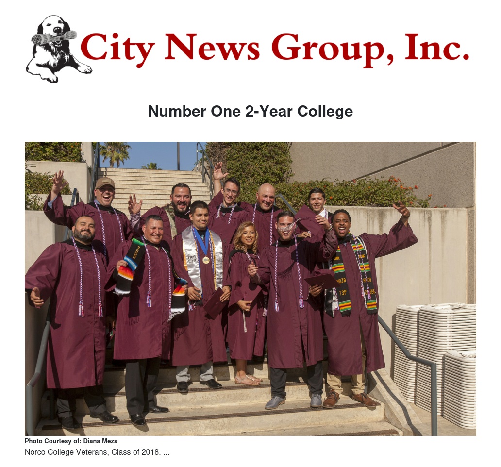 "What an honor to be repeatedly ranked among the best colleges for veterans," said Bryan Reece, president of Norco College. "We are committed to supporting our student veterans and continue to provide resources to help them transition from classroom to career. We share this excitement with our tremendous employees and incredible business partners working alongside us." Norco College has a 73 percent military retention rate and a 67 percent graduation rate. In 2015, Norco College ranked number 20 on the “Best for Vets” list and top 16 in 2017 and 2018.