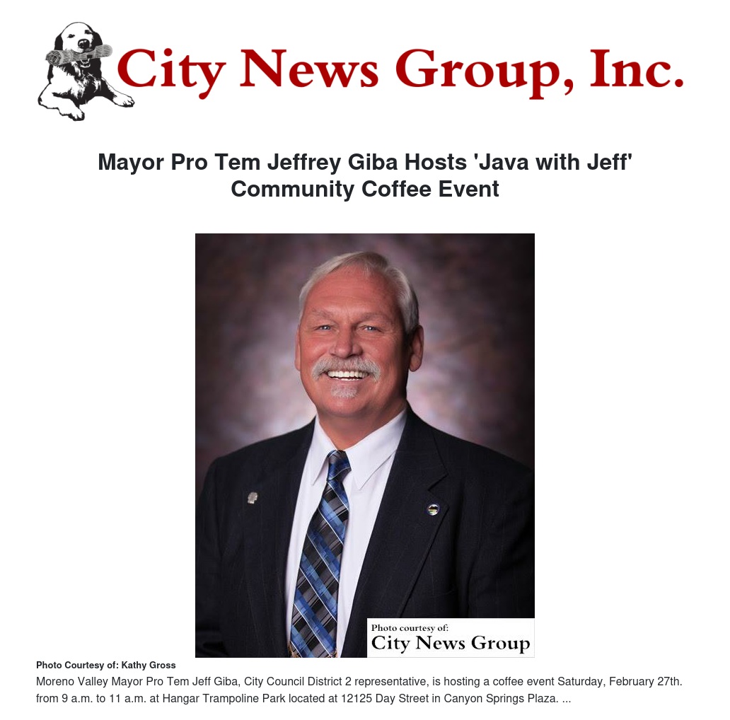 MORENO VALLEY >> Moreno Valley Mayor Pro Tem Jeff Giba, City Council District 2 representative, is hosting a coffee event Saturday, Feb. 27. from 9 a.m. to 11 a.m. at Hangar Trampoline Park located at 12125 Day Street in Canyon Springs Plaza.