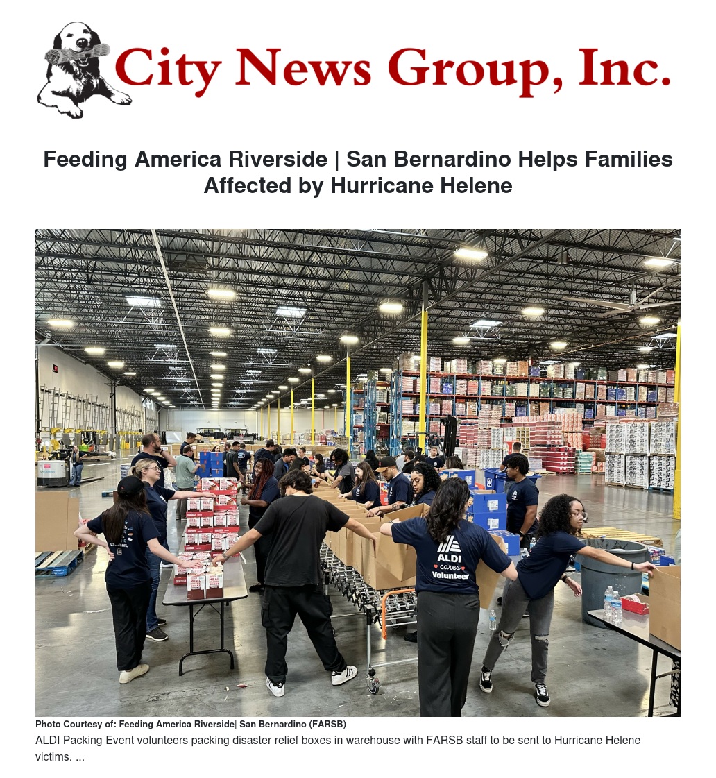 Feeding America Riverside | San Bernardino (FARSB) has distributed 22,000 pounds of disaster relief boxes to support families impacted by Hurricane Helene. This effort was made possible by a volunteer event hosted by ALDI at their Moreno Valley distribution center, where Aldi team members worked together to assemble 800 disaster relief boxes to be used in the event of an emergency.