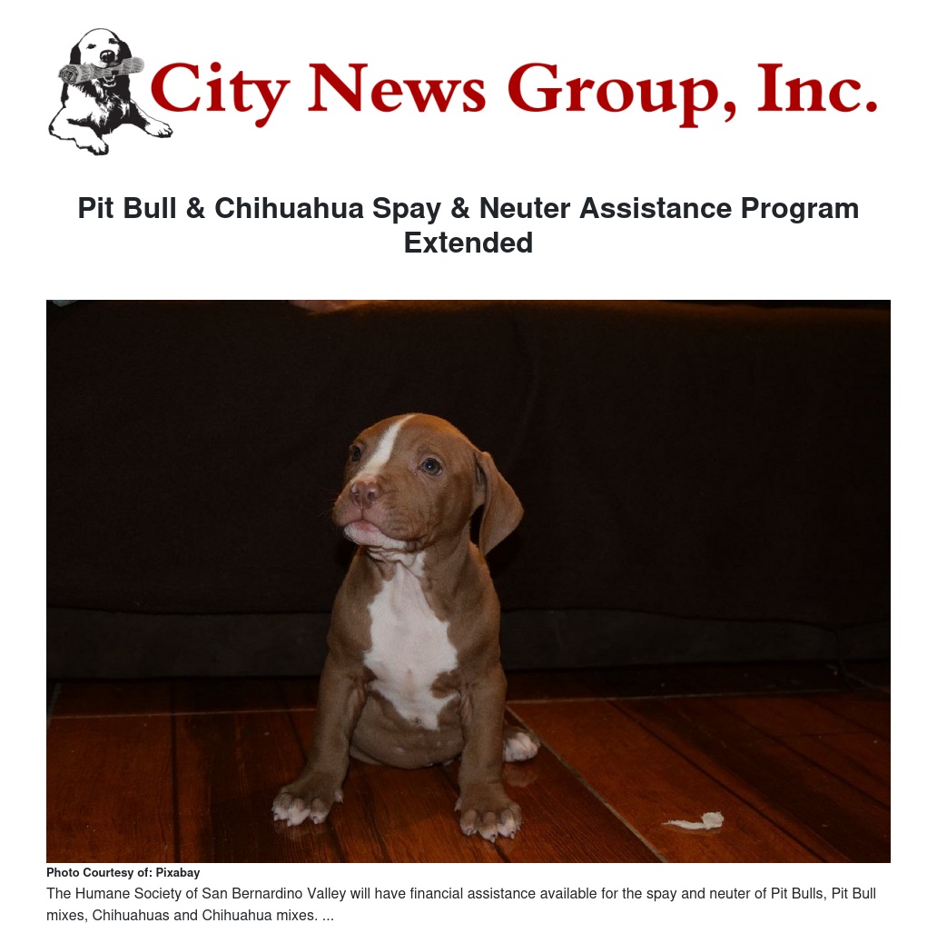 Thanks to a generous extension grant from the Jason Debus Heigl Foundation and The Coalition for Pets and Public Safety, the Humane Society of San Bernardino Valley will have financial assistance available for the spay and neuter of Pit Bulls, Pit Bull mixes, Chihuahuas and Chihuahua mixes. These surgeries will be offered for only $20 while funding lasts. In cases where both male and female pit bulls/Chihuahuas come in for surgery from the same household, the $20 co-pay will be waived.