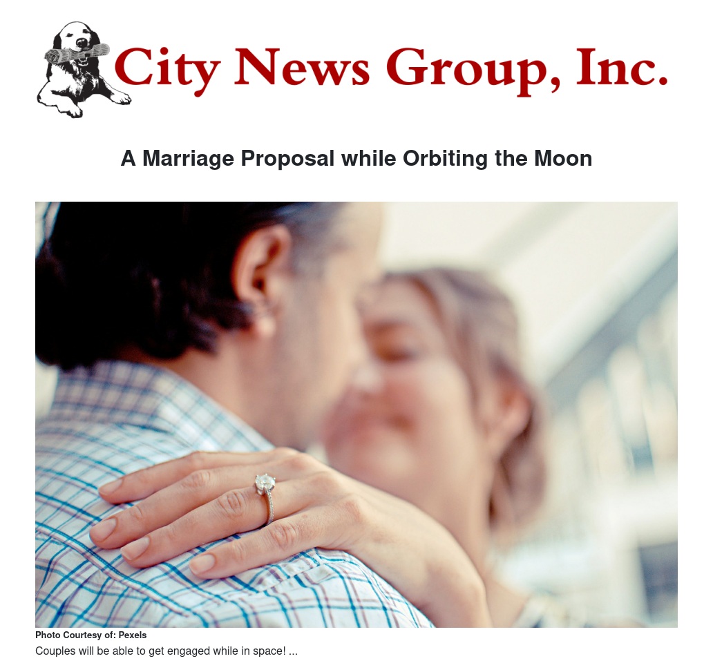 Starting in 2022 it will be possible to ask for the beloved’s hand in marriage while flying over the lunar surface to the sound of Frank Sinatra’s "Fly Me to the Moon". The one-week interplanetary flight will be carried out using a self-contained and autonomous spacecraft allowing the two lovers to travel alone.