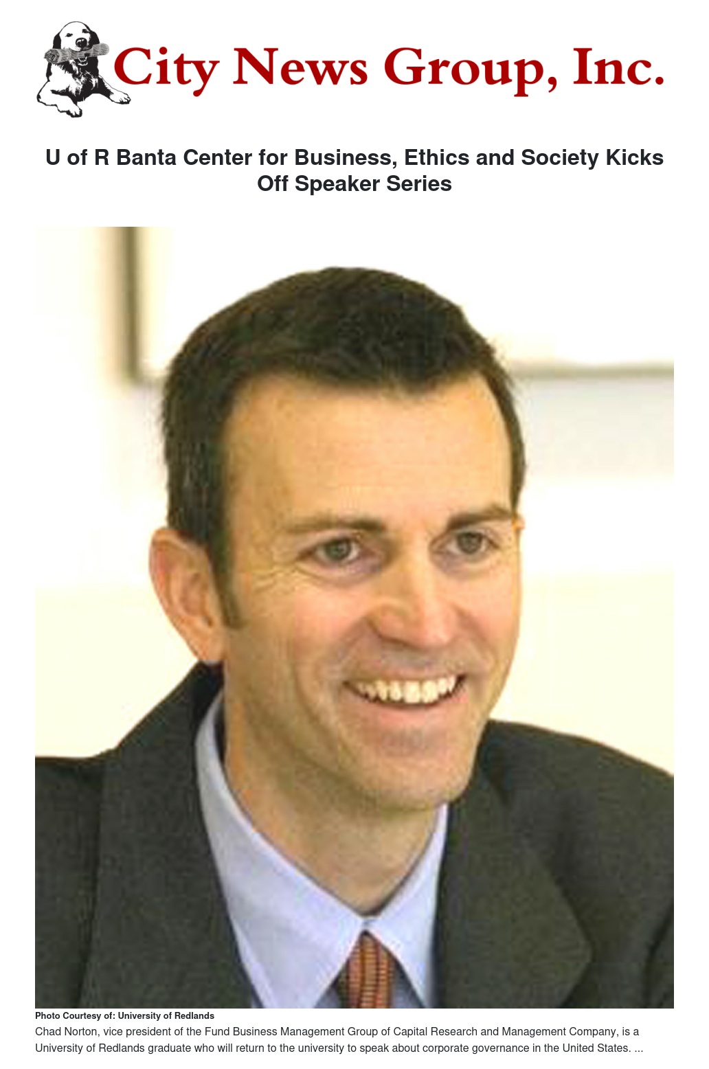 The University of Redlands will kick off its 2013–2014 Banta Center for Business, Ethics and Society Speaker Series on Oct. 8, featuring Chad Norton ’83, vice president of the Fund Business Management Group of Capital Research and Management Company. Norton will speak about corporate governance in the United States.