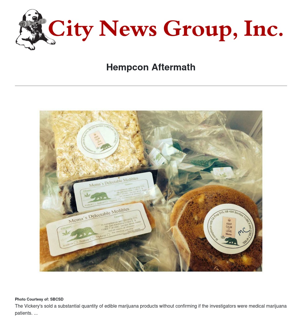 California medical marijuana laws specifically apply to qualified medical marijuana patients. The distribution and sales of marijuana to non-qualified medical marijuana patients constitutes the illegal distribution and sales of marijuana. While inside the restricted area, investigators were approached by a couple who identified themselves as George and Betty Vickery. The Vickerys gave investigators free samples of marijuana candy and indicated they were soliciting customers for their business “Mema’s Delectable Medibles.” Throughout the venue, undercover investigators were approached by vendors seeking customers interested in making large purchases of marijuana and marijuana products.