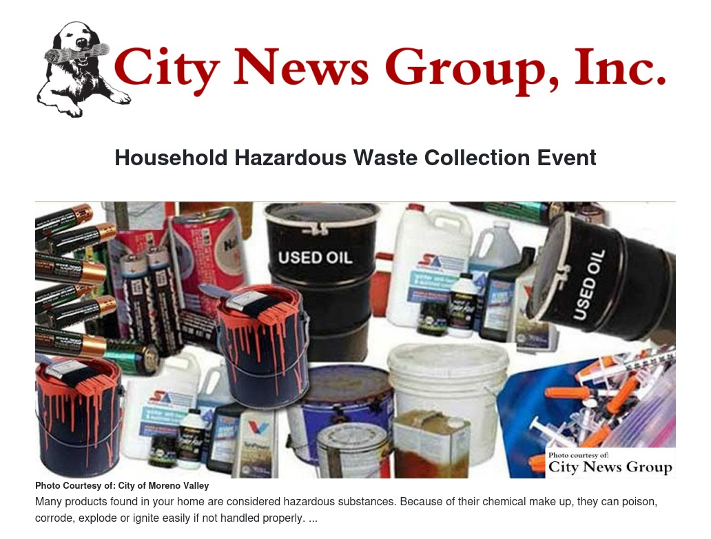 MORENO VALLEY >> The City of Moreno Valley and Riverside County Waste Management Department will host a Household Hazardous Waste (HHW) collection event on Saturday, April 16, at the City Corporate Yard located at 15670 Perris Blvd from 9 a.m. - 2 p.m. This event is open to all Riverside County Residents. The City would also like to remind patrons that the event will take place on Saturday only.