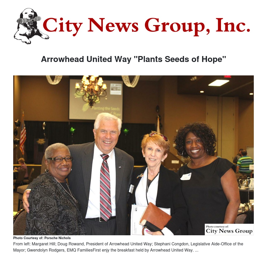 Arrowhead United Way recently hosted its Annual Meeting and Community Awards Breakfast at the National Orange Show in San Bernardino. The theme was “Planting Seeds of Hope," an inspirational message to encourage the community to share the good feeling of hope with everyone around them.