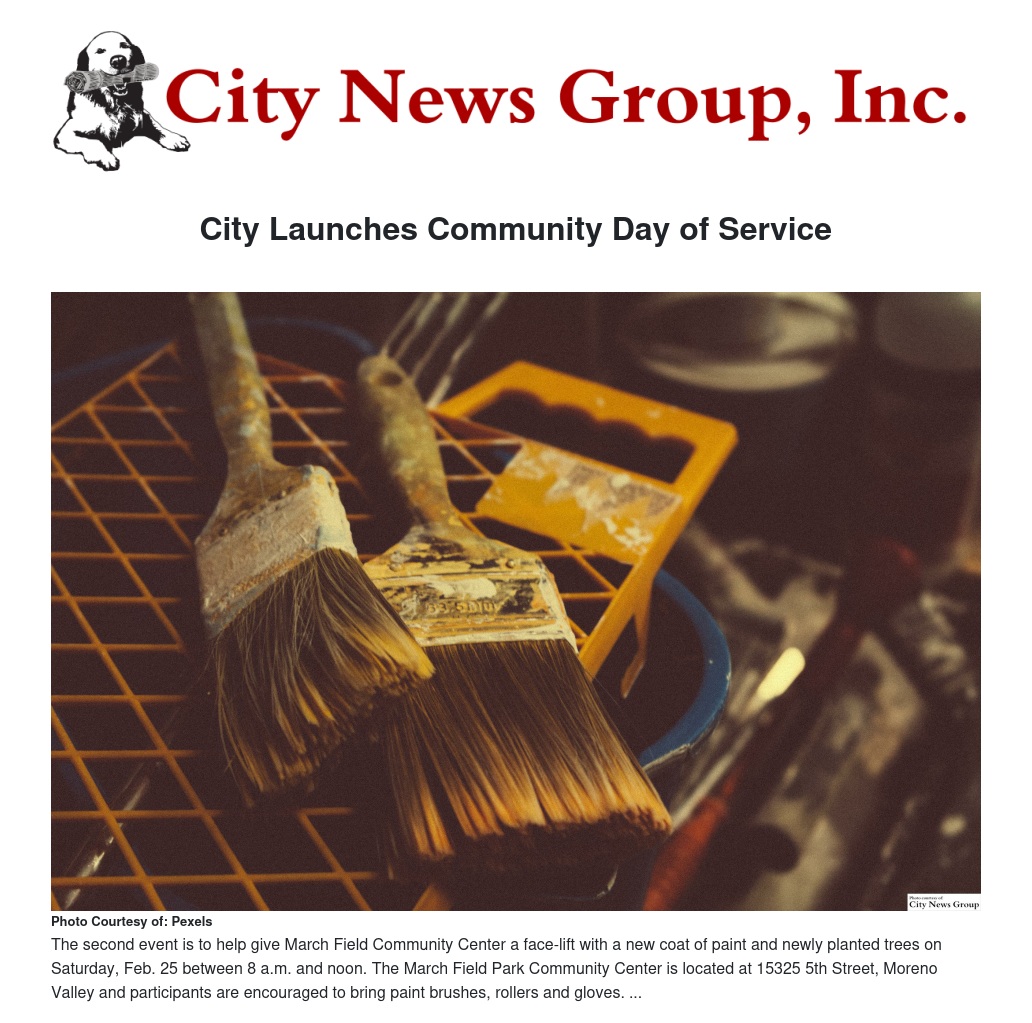MORENO VALLEY>> The City of Moreno Valley is hosting its first Community Day of Service on Saturday, Feb. 25, as residents of all ages work together to beautify the Moreno Valley community.