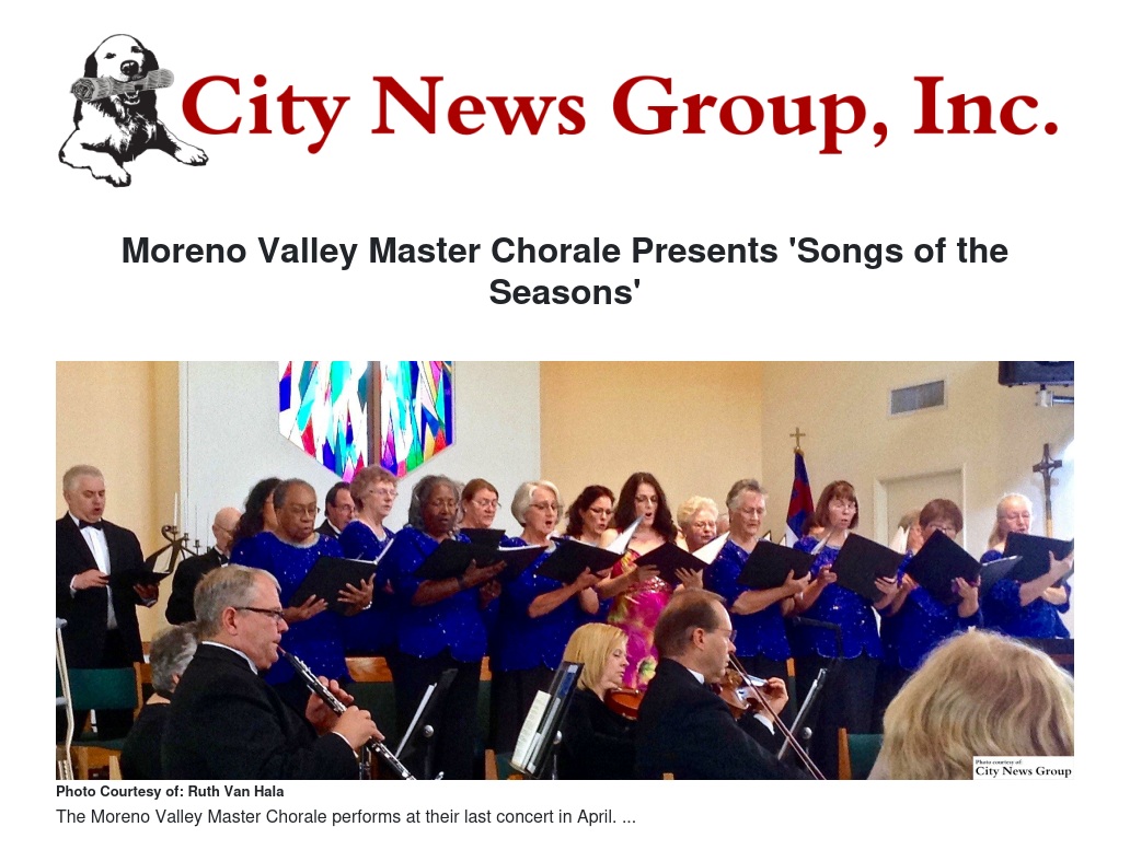 The Moreno Valley Master Chorale will present their next concert, “Songs of the Seasons,” on Sunday, June 5, 2016 at 4 p.m., at Shepherd of the Valley Lutheran Church located at 11650 Perris Blvd. in Moreno Valley.