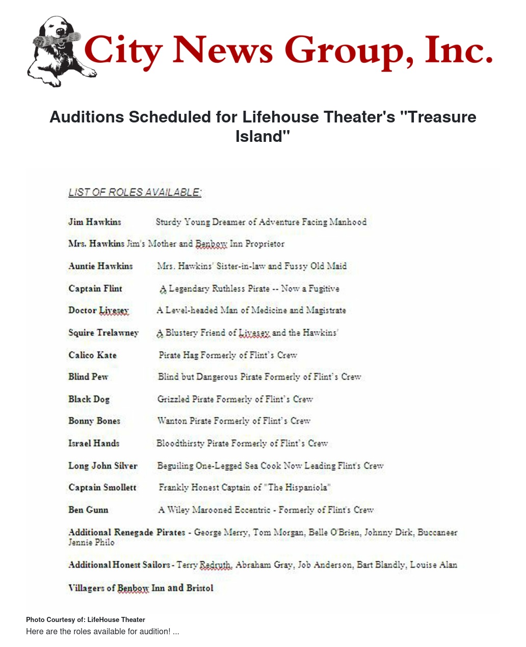 Auditions Scheduled for Lifehouse Theater's "Treasure Island"
