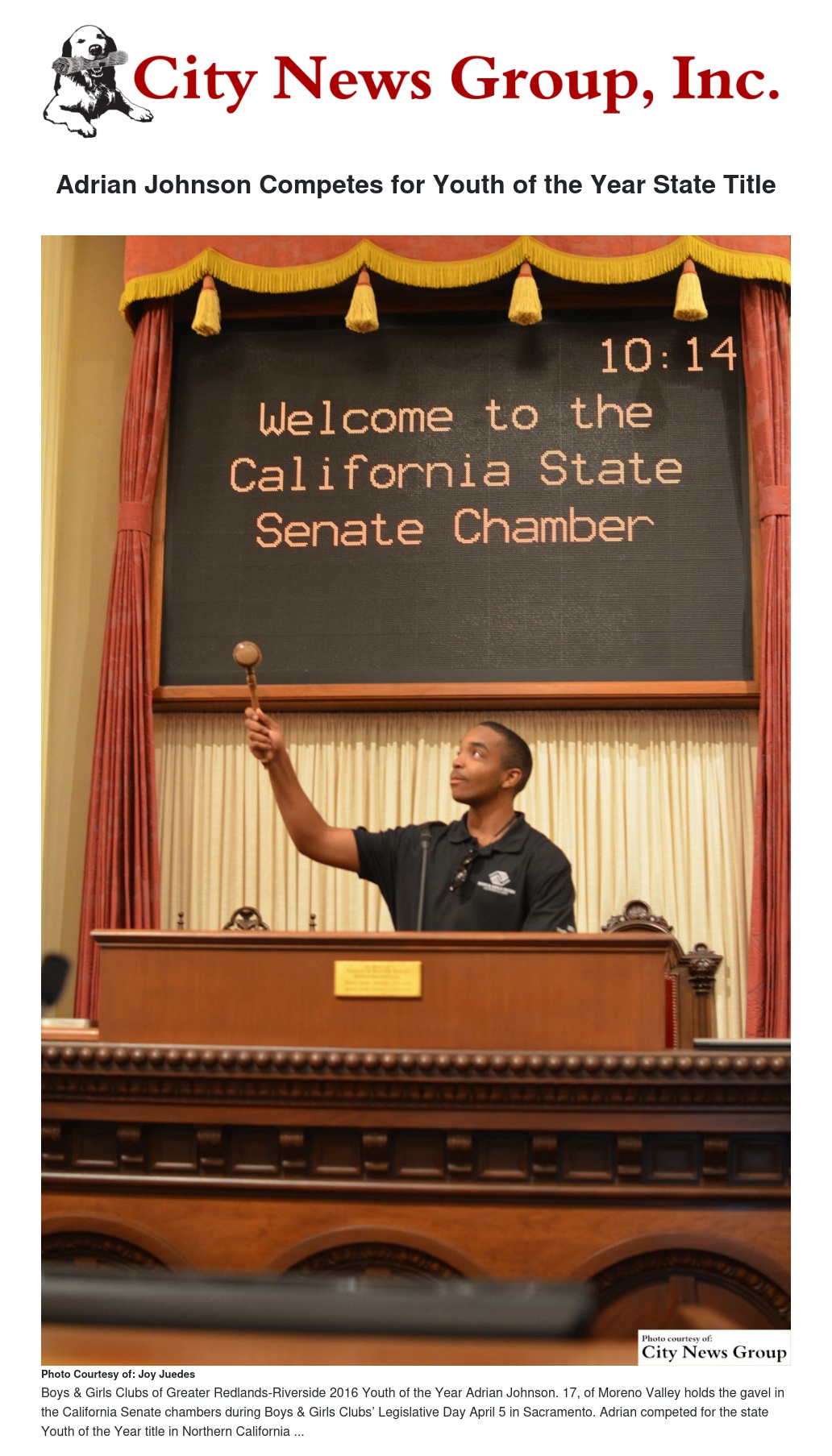 Boys & Girls Clubs of Greater Redlands-Riverside will honor Adrian and its Youth of the Year Ambassadors at the Be Great Awards May 6 in Moreno Valley. For more information on the event, visit http://www.begreatie.org/#!be-great-awards/c1roa