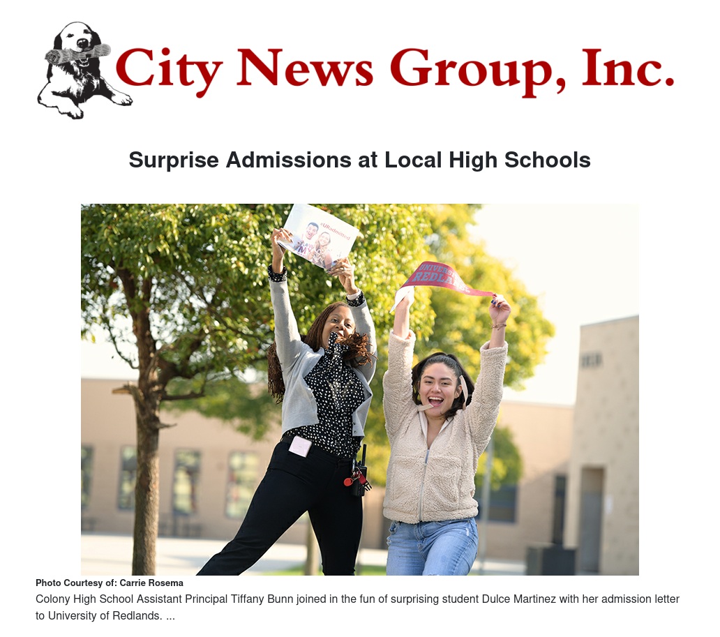 Rancho Cucamonga High School student Linda Reynoso and Colony High School student Dulce Martinez were among 10 seniors in the Chaffey Joint Unified School District (CJUSD) surprised with letters of admission to the University of Redlands on December 12. U of R officials made site visits to congratulate Early Action applicants at Los Osos, Etiwanda, Rancho Cucamonga, and Colony high schools.