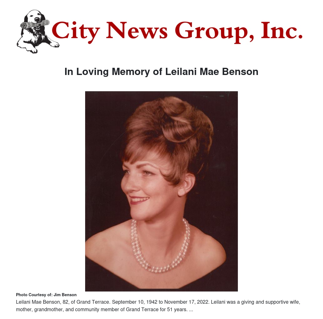 Leilani Mae Benson, 82, of Grand Terrace went home to be with the Lord on November 17, 2022.