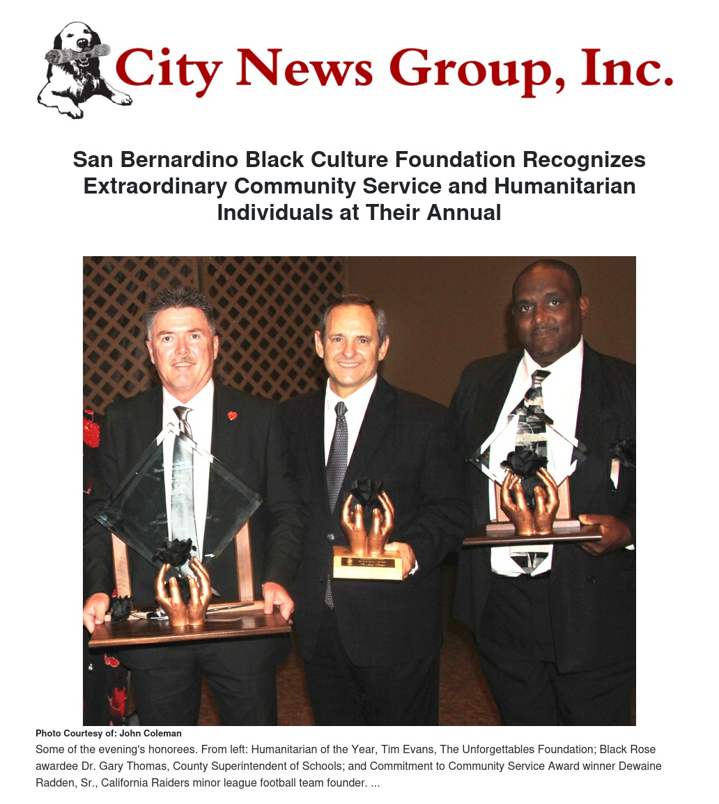 To a crowded room, The Unforgettables Foundation founder Tim Evans accepted the San Bernardino Black Culture Foundation’s most prestigious award during the organization’s 25th Annual Black Rose Event as he was named 2014 Humanitarian of the Year.