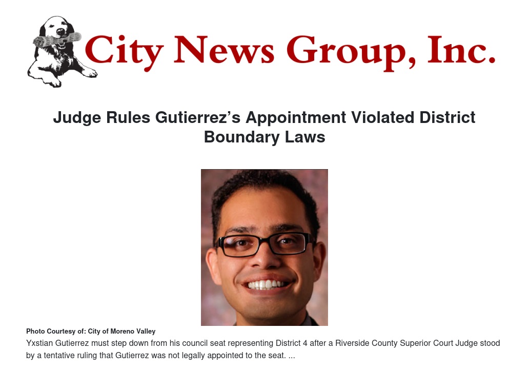 Moreno Valley’s District 4 Councilman, Yxstian Gutierrez, must leave office by Aug. 5 as ordered by a judge who stood by his tentative ruling July 29 that the councilman was not legally appointed to the seat.
