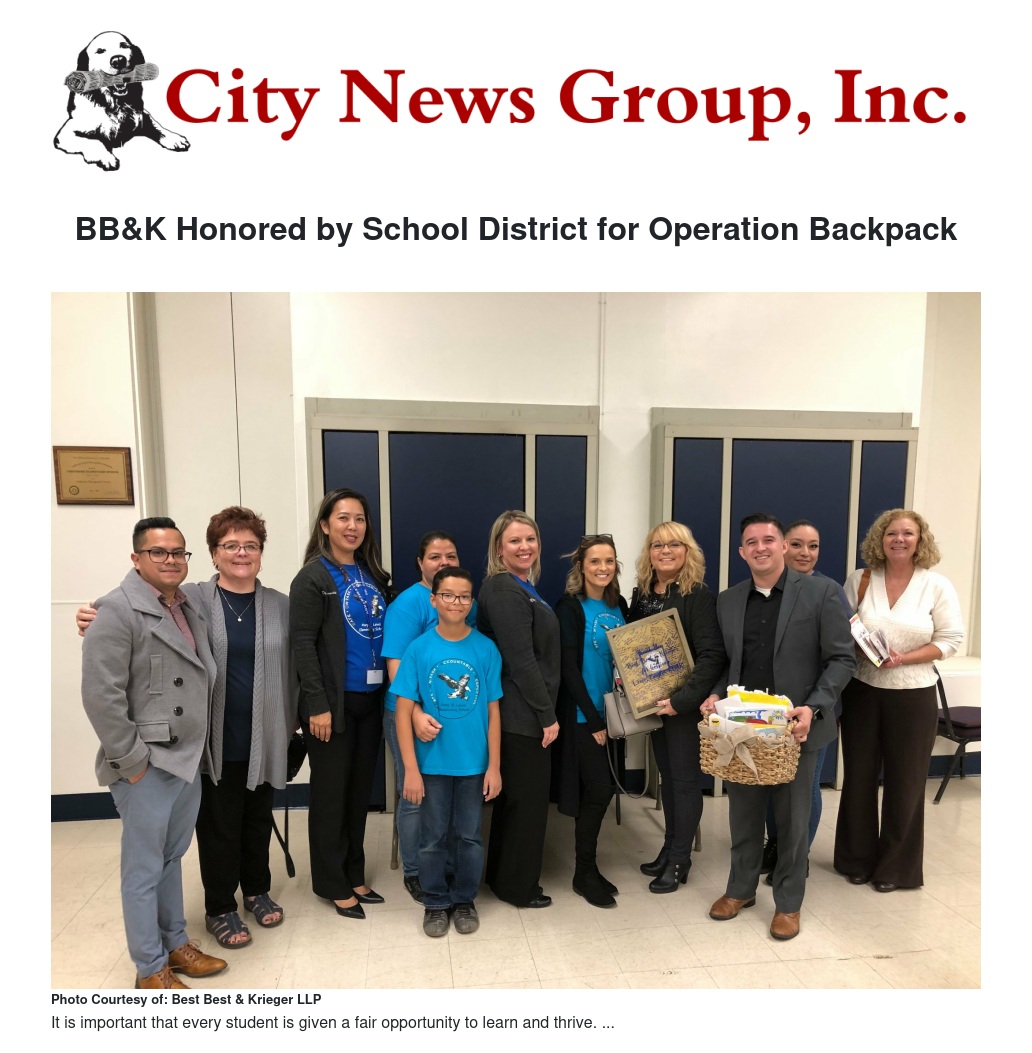 The Colton Joint Unified School District has recognized Best Best & Krieger LLP as its Education Partner for the month of October. In a ceremony at the District’s headquarters last Thursday night, the firm was honored for its Operation Backpack program, through which every student at Mary B. Lewis Elementary School was donated a backpack filled with school supplies on the first day of the school year.