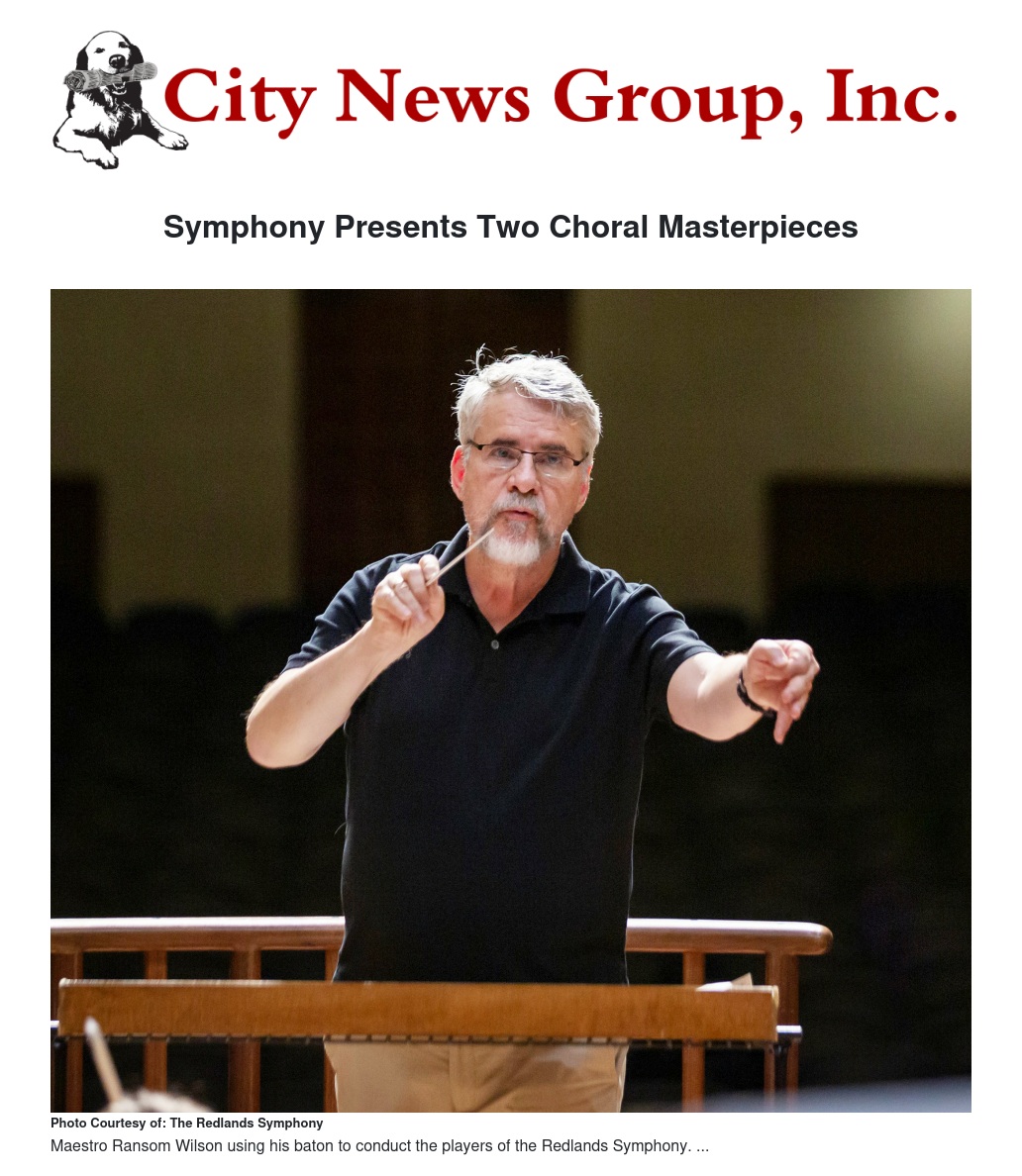 Maestro Ransom Wilson will conduct a concert celebrating the human voice when the University of Redlands Chapel Singers under the direction of Dr. Nicholle Andrews, Director of Choral Studies, and five soloists join the Redlands Symphony in a wonderful program featuring Vivaldi's Gloria and Bach's Magnificat in D. The concert is scheduled for Saturday, April 6, 2019 in Memorial Chapel on the campus of the University of Redlands. Doors open at 7 PM. The Concert begins at 8 PM. A pre-concert talk by Maestro Wilson will begin at 7:15 PM. Tickets for the concert can be purchases online at www.redlandssymphony.com, by calling the box office at (909) 587-5565 or at the door the night of the performance. Ticket prices begin at $15.